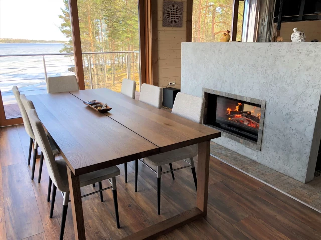 Двухэтажный коттедж с дровяной сауной. Номер первой категории. Расположен прямо на берегу Ладожского озера. Первый этаж коттеджа состоит из просторной прихожей, кухни-гостиной, ванной комнаты. На втором этаже две спальни и санузел. Коттедж оборудован всем необходимым для комфортного проживания: холодильник, варочная панель, посудомоечная машина, микроволновая печь, чайник, комплект посуды, фен, стиральная машина, вся необходимая мебель, в том числе большой диван, где с комфортом можно дополнительно разместить 2 человека, мангал. Комфортное размещение до 6 человек. Общая жилая площадь коттеджа 120 м.кв.